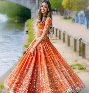 ଏଥିସହିତ ଦର୍ପଣ ବା ମିରର କାମ ହୋଇଥିବା କମଳା ରଙ୍ଗର ଲେହେଙ୍ଗା ମଧ୍ୟ ଆପଣ ଟ୍ରାଏ କରିପାରିବେ।
